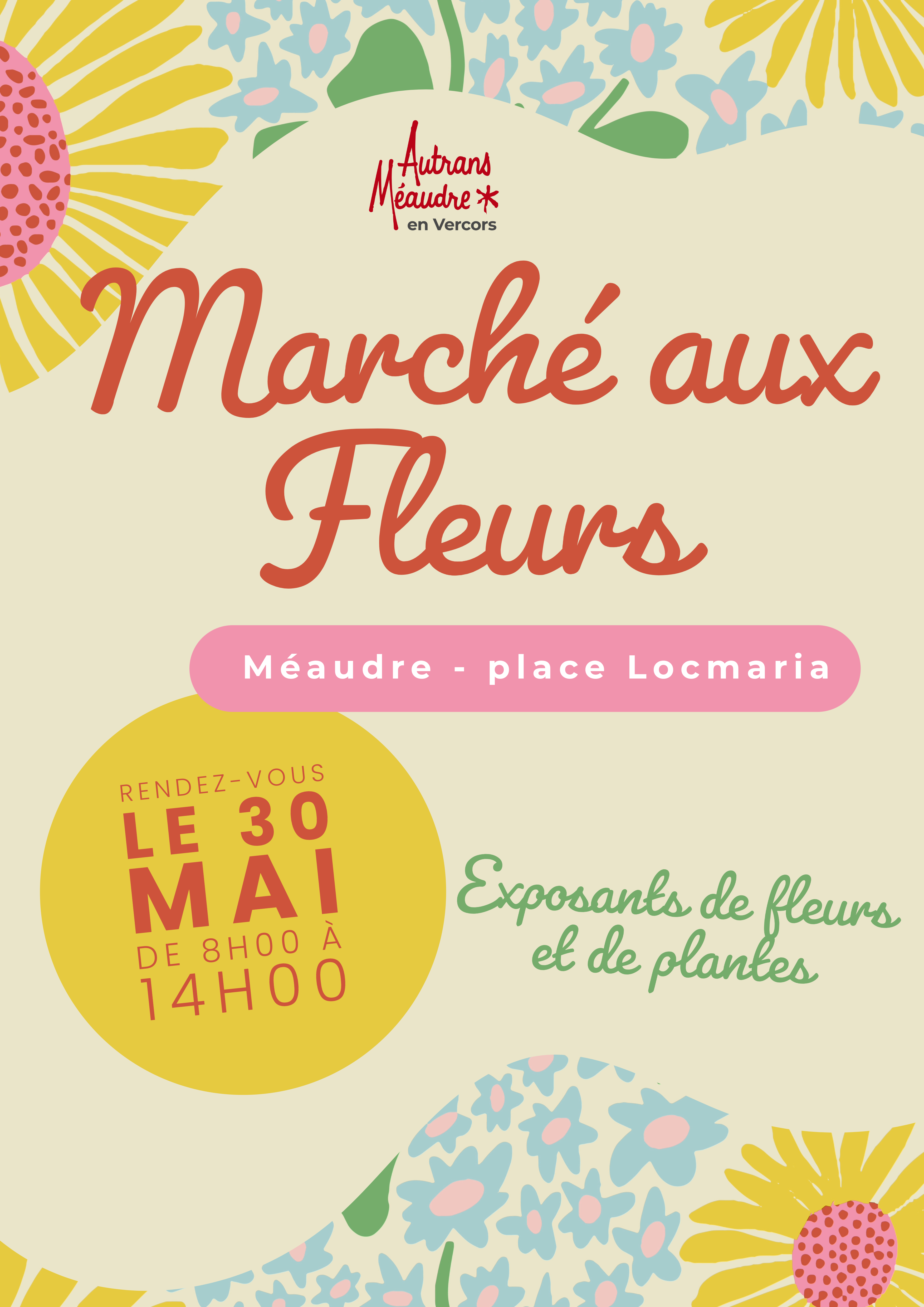 Marché aux fleurs 2026 Cette année, le marché aux fleurs se tiendra le samedi 30 mai 2026, de 8h à 14h place Locmaria à Méaudre.